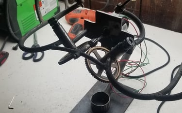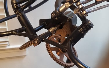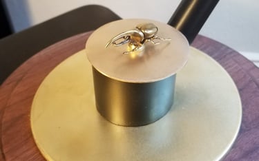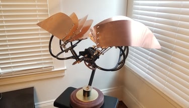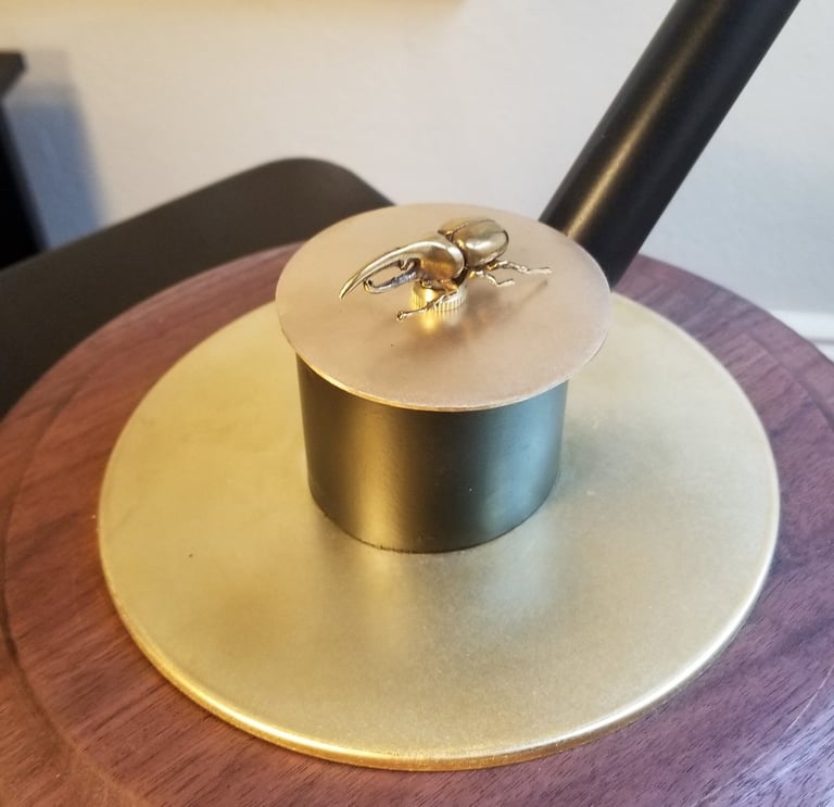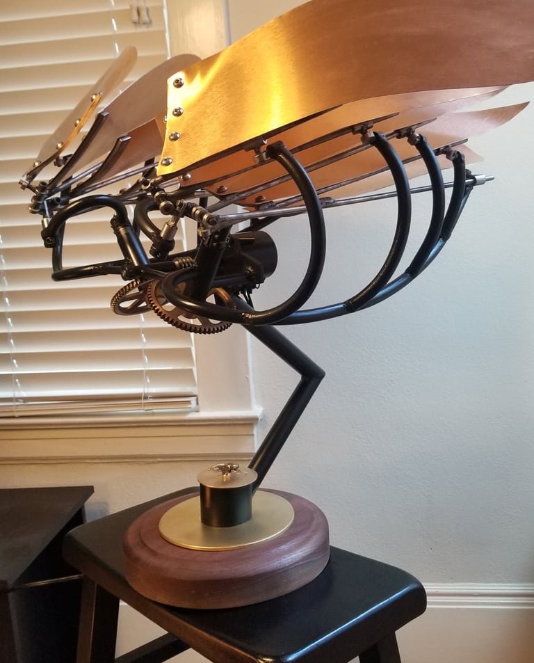 Bob Potts is one of my favorite artists and this piece is my version of his "Auspicious Messenger". The way these pieces move through simple mechanical principles are truly special. This flying machine reminds me of an insect, and so I added a brass beatle as the electric motor switch.