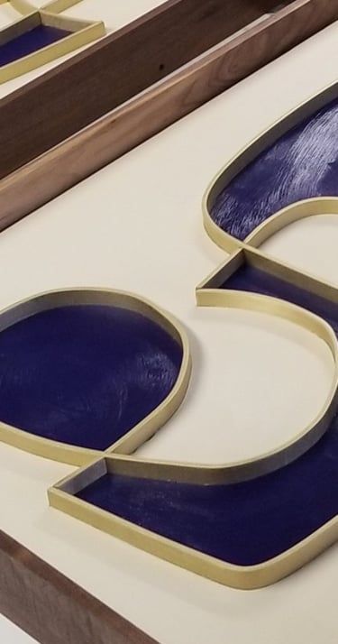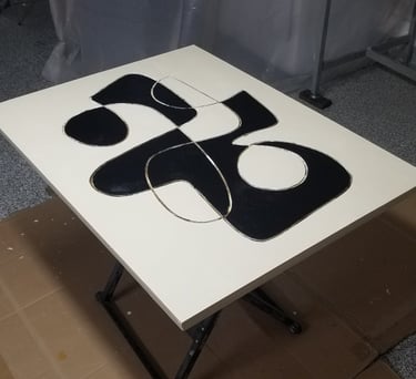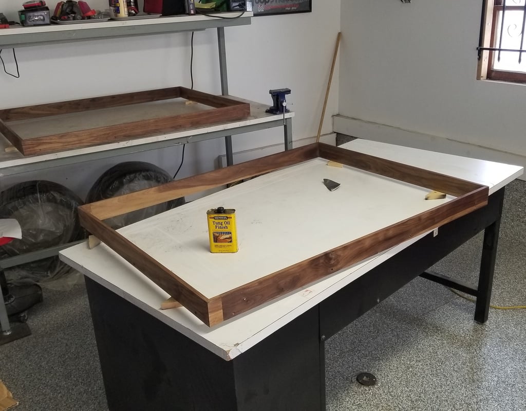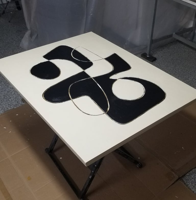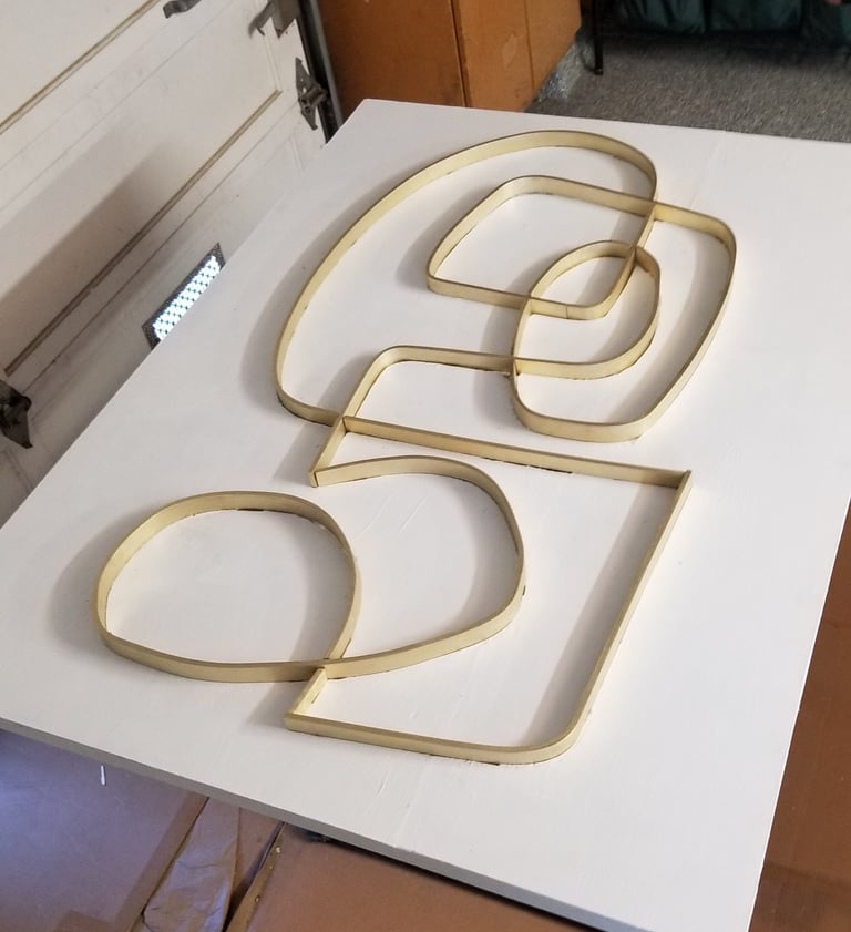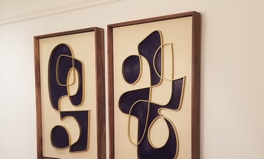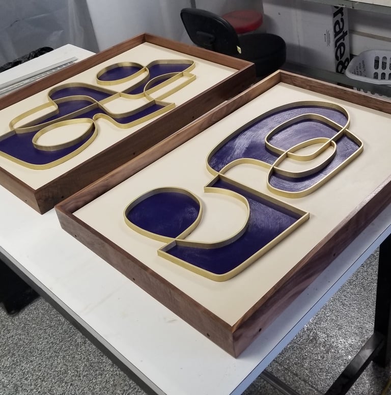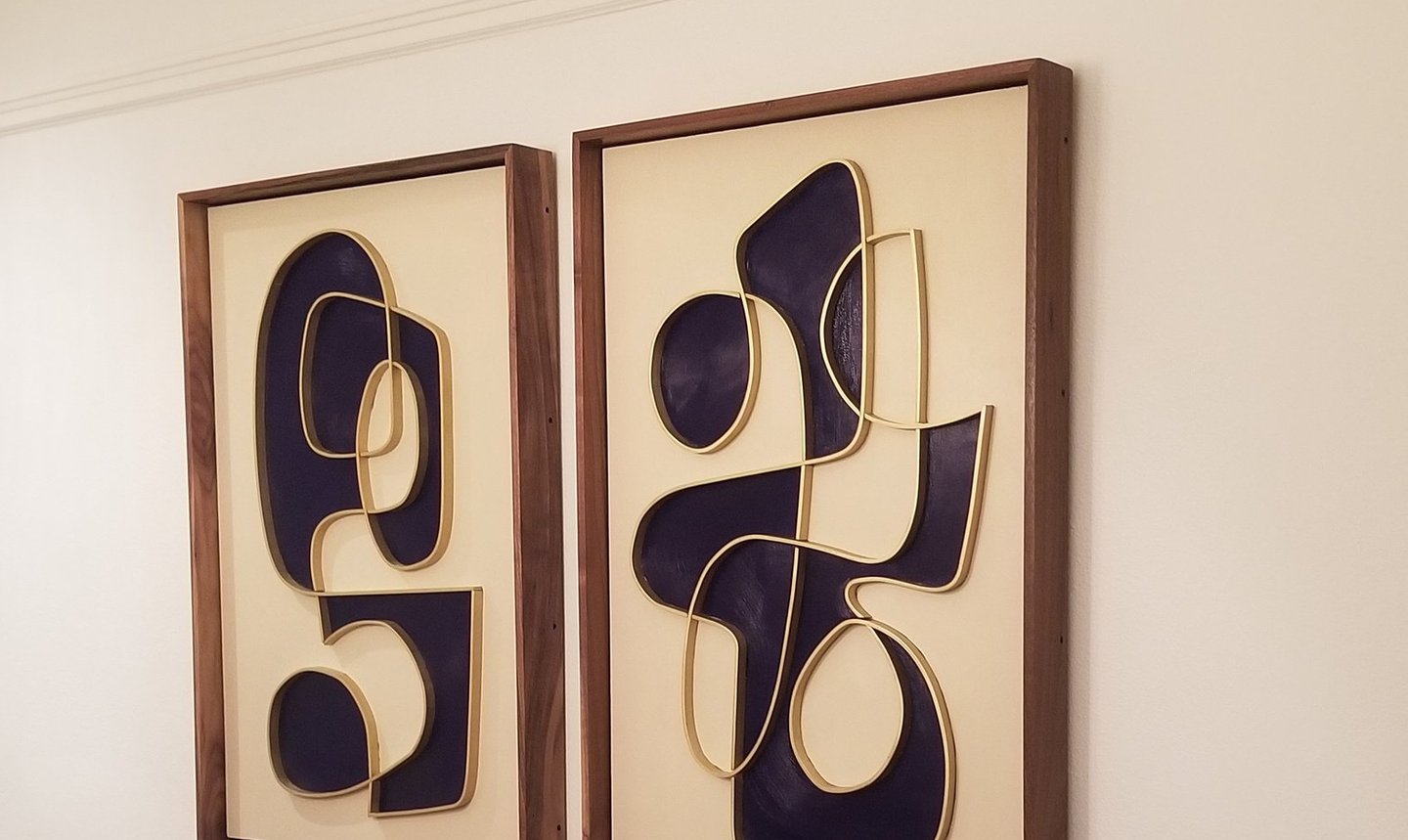 The pieces are made of a wood panel that is pained with acrylic and inlaid with solid brass. The frame is made of Walnut.